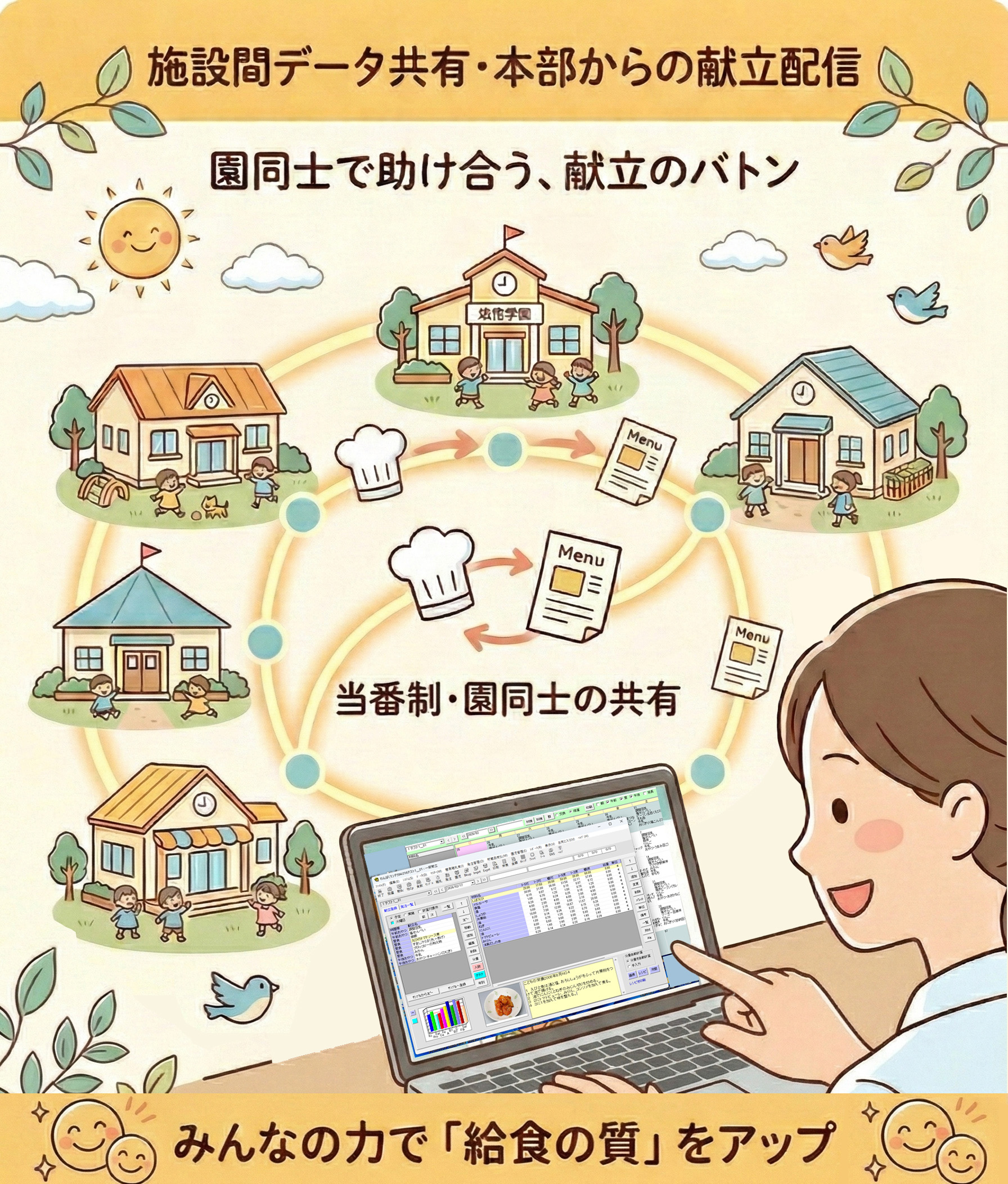 株式会社アドムは、こどもたちがより健康的で正しい食習慣が獲得できることを目的として、 給食管理ソフト「わんぱくランチ」や給食レシピ、食育のためのリソースを保育園や幼稚園にご提供しています。