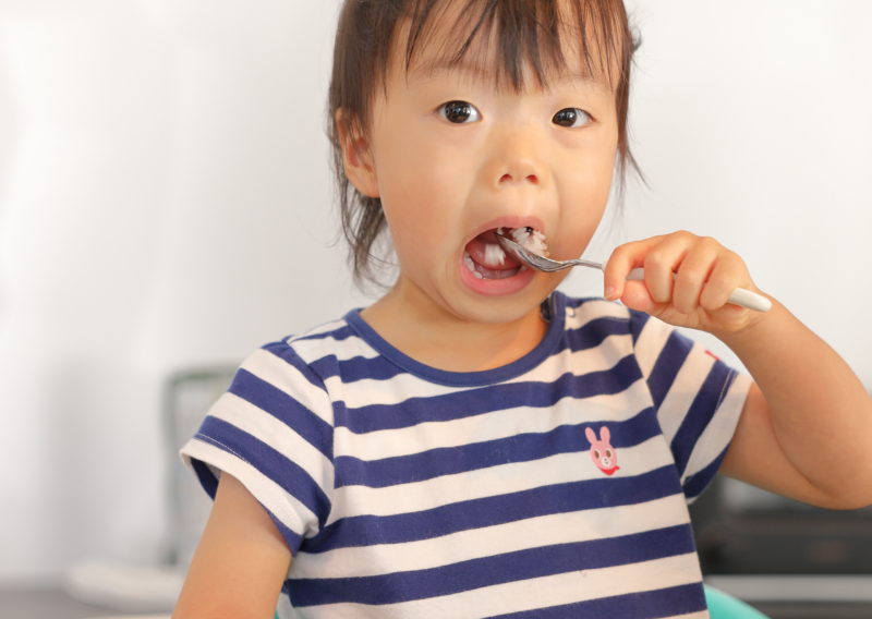 「子どもの噛む力をつけさせるために、何を食べさせたらいいですか」。わんぱく子どもの食事研究所への、問い合わせが多い内容の一つです。 「なぜ噛むことばかりに固執するのでしょうか。そんなに噛むことが大事ですか」とは、歯科医師の綾野理加先生。先生が得意とされている「食べる機能」に着目することで、私たちがいかに「“噛むことでおいしくなる”という考えにとらわれている」かに気づかされます。 子どもたちの「食べる機能」の発達を知り、実際に子どもたちの様子を確認しながら、食事内容や与え方を考える。成長に合わせて、食べる意欲を引き出し、おいしさが感じられる献立作りを進めていきたいです。(わんぱく子どもの食事研究所所長・佐橋ゆかり) 佐橋 子どもたちの「食べる機能」の発達を知り、実際に子どもたちの様子を確認しながら、食事内容や与え方を考える。成長に合わせて、食べる意欲を引き出し、おいしさが感じられる献立作りを進めていきたいです。 「わんぱく子どもの食事研究所」では、子どもの健康増進に役立つ情報を発信したいと考えています。先日、綾野先生の「食べる機能」に関する講演を聞き、咀嚼に関して知らないことが多く、園で給食に関わる多くの人にも伝えたいと感じました。 綾野先生 どこへ行っても、「どうやったら上手に噛めるようになりますか」「何回噛んだらいいですか」や、「噛む力をつけさせるために、何を食べさせたらいいですか」といった質問ばかりを受けます。噛むことがそんなに大事でしょうか。 何のために噛むかというと、ごはんを食べるだけのこと。ヨーグルトは、リンゴやナタデココが入っていなかったら飲みますよね。噛まなくていい。食べ物の硬さに応じて、口の動かし方が変わるわけです。噛むことで、形があるものを砕いて、砕いたものが唾液の中に混じって、味物質が唾液に溶け込んで、ベロのひだひだの奥にある味蕾(みらい)細胞を刺激して、おいしい味が分かる