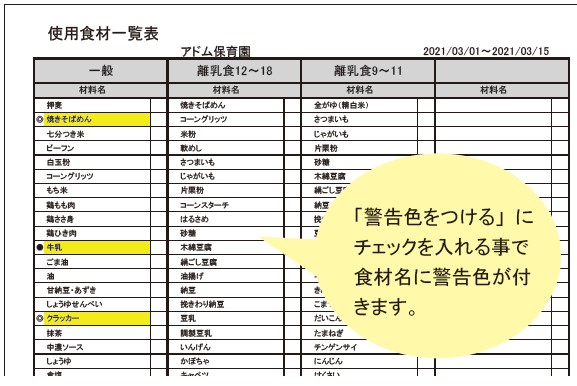 2021年10月15日 10:00 am 各離乳期で使用している食材を期間を設定し印刷できます。 アレルギー献立管理画面で作成した「離乳食献立」「アレルギー献立」に使用した食材を一覧で出力することができます。 出力する期間を選択することができるので離乳期の保護者に配布する食材リストとして役立ちます。 「使用食材一覧表」を印刷する 「印刷」アイコンをクリックします。 開いた画面から「アレルギー」タブを選び、F615 使用材料一覧表を選択します。このコンテンツはサイト会員限定のコンテンツです。会員の方はログインしてください。既存ユーザのログインユーザー名またはメールアドレスパスワード ログイン状態を保存する Categorised in: わんぱくランチ活用術 This post was written by アドム <<前のページへ 次のページへ>>